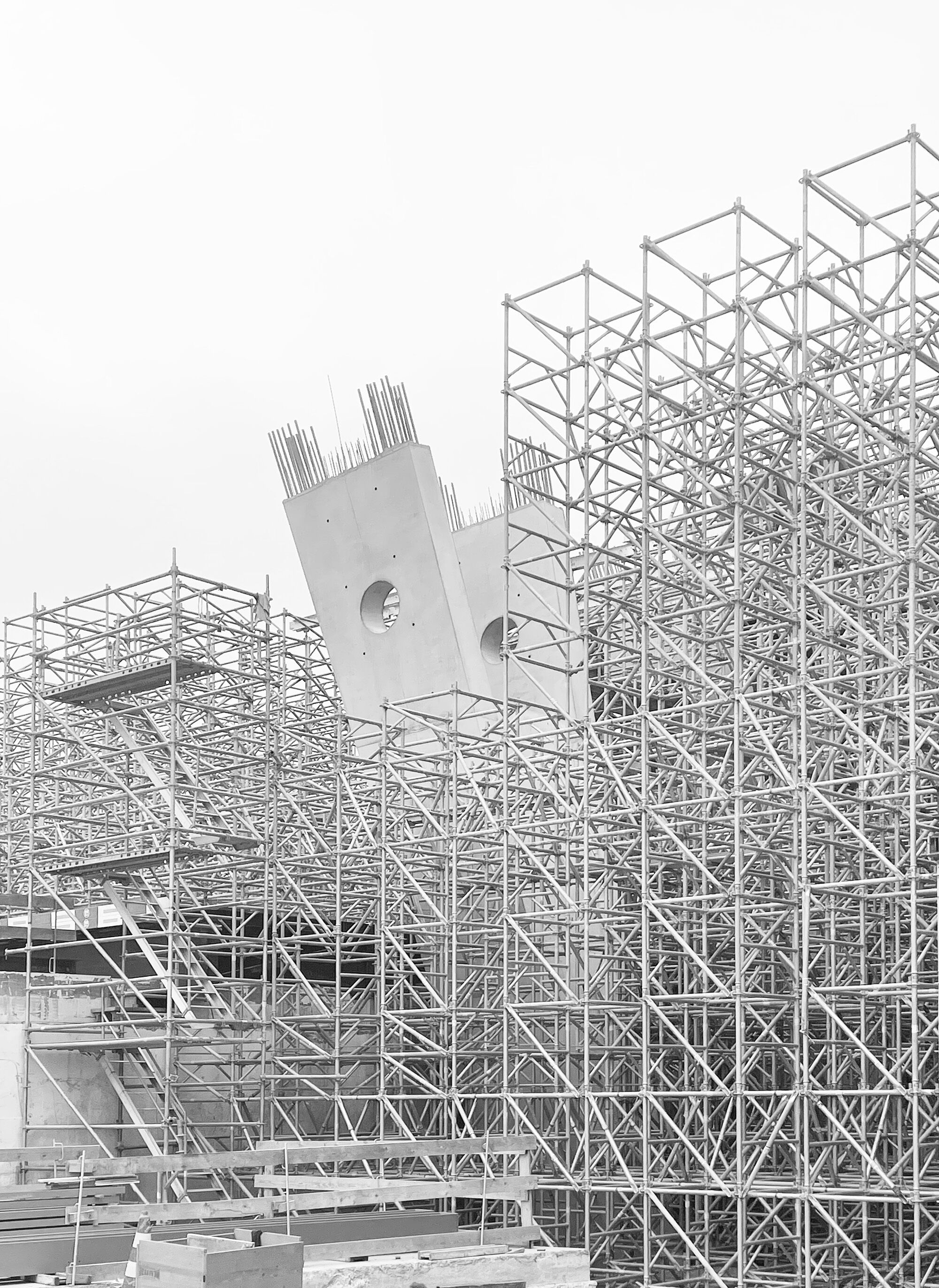 Schrägstütze und Leergerüst zur Erstellung der Gebäudeauskragung für das Hauptgebäude der städtischen Elektrizitätswerke auf dem ewz Areal Herdern in Zürich.