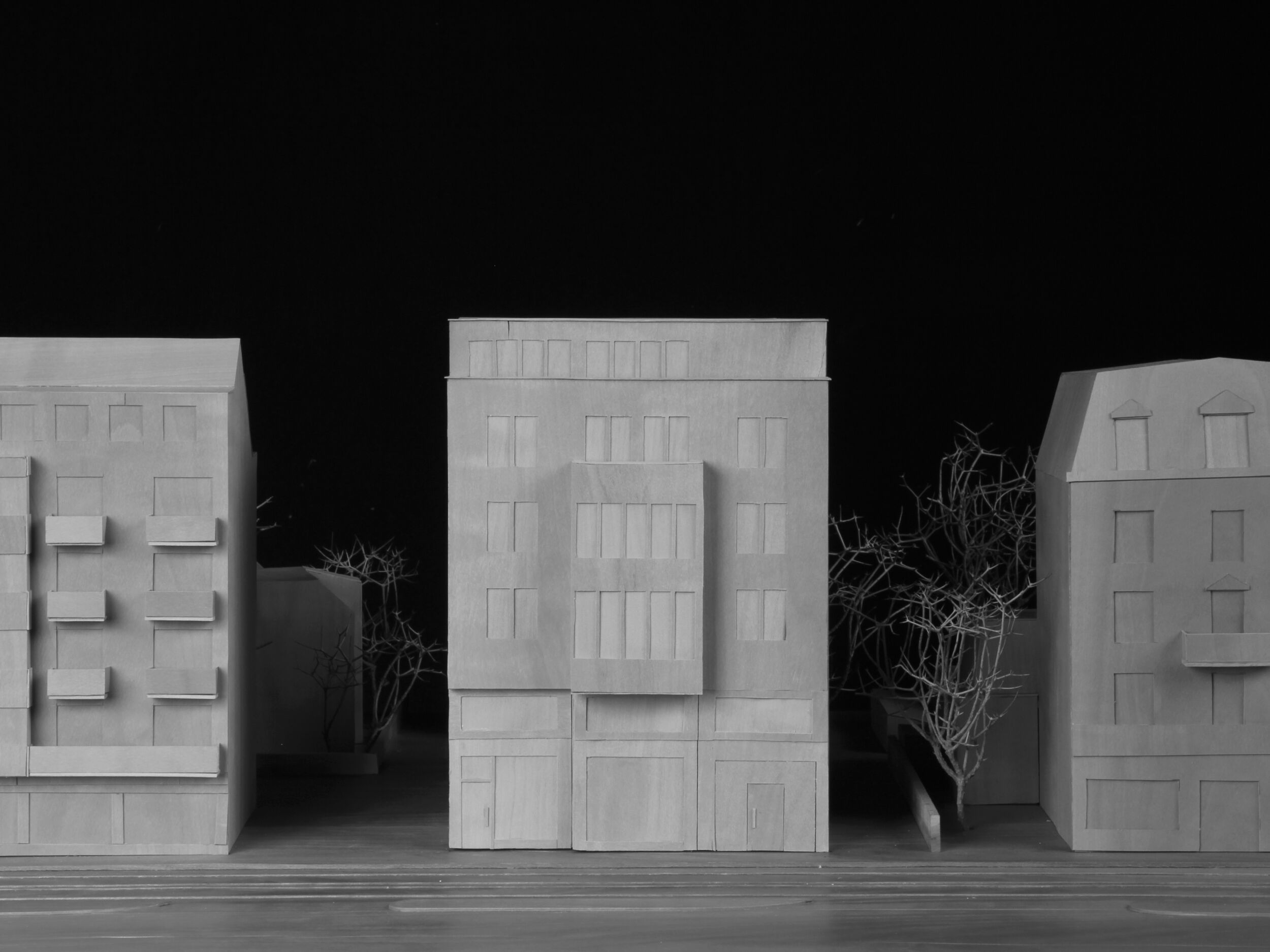 Der Stadtkörper im Werd zeichnet sich neben dem hart begrenzten Strassenraum durch die zunehmende 5-Geschossigkeit, verbunden mit Läden in den Erd- und Mezzaningeschossen, und den geschlosseneren oberen Wohnetagen aus. Die strenge Symmetrie der Strassenfassade mit dem mittigen Schaufenster wird konzentriert durch die Betonung des Erkers und in Spannung versetzt durch die Asymmetrie der unterschiedlichen Eingänge. Die Tiefe des Ladens und die zusammenhängenden Nutzungen in den oberen Geschossen lassen ein separiertes Hofgebäude obsolet erscheinen. Die hintere Abstufung zum Hof hin übernimmt die Höhe der maximal zwei Vollgeschosse und leitet sie in eine stark rhythmisierte Stufung des Volumens ein.