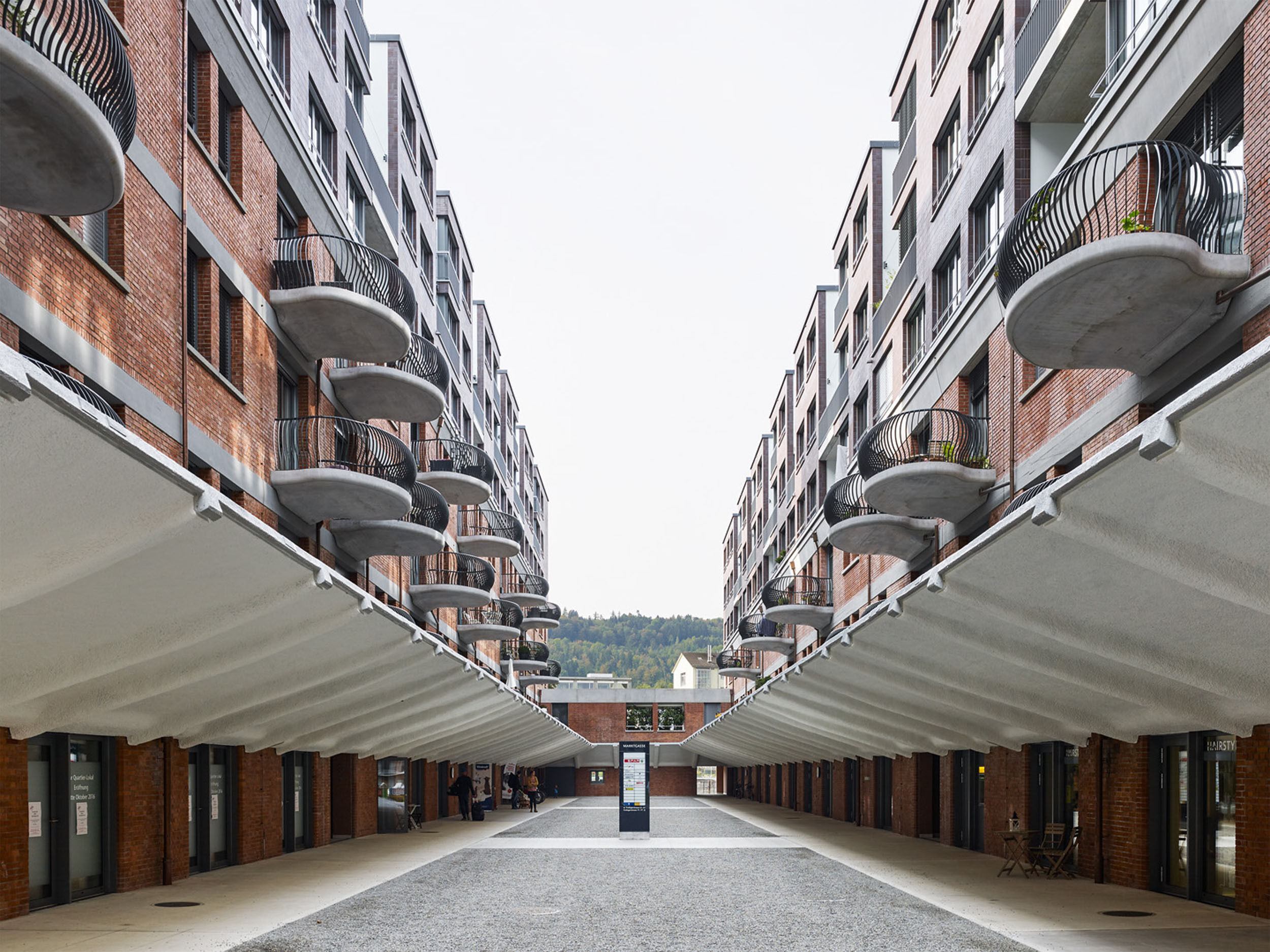 Im Bestandesbau bildet die Verbindung des Stützenrasters von 5 x 5 Metern und der Gestalt der voutenförmigen Pilzköpfe mit den Anforderungen des Wohnungsbaus die zentrale entwerferische Herausforderung. Erst die Wahl des orthogonalen Mäanders eines nichttragenden Wandsystems generierte die geometrischen Hypothesen, die in der Entwicklung der Grundrisse die Bereiche des Stützenrasters mit den im Wohnen notwendigen Möglichkeiten zur Abtrennung koordinierte. Im Äusseren offenbart einzig die Durchdringung der umfassenden Backsteinwand mit Balkonen «borrominesker» Art die veränderte Nutzung. Für die dreigeschossige Aufstockung des 24 m tiefen Baukörpers wurde durch Isolierung und Neukombination einzelner Teile ein Fünf- und Sechsspännertyp entwickelt, der hohe Dichte mit zweiseitiger Orientierung der Wohnungen verbindet. Das modernistische Dogma der optimalen Besonnung durch West-Ost-Ausrichtung wird in diesem Ansatz zugunsten einer Über-Eck-Orientierung der Wohn- und Essräume aufgegeben. Diese Eckbildungen bedingen Einschnitte in den Baukörper und plastische Weglassungen an den Längsseiten der zusammengefügten Wohnungen, die den schwierigen Komplex der Einsicht und Nähe unerwartet in Wohnungen mit inneren Blickbeziehungen, einem eigenen Patio und unterschiedlichen Aussenraumbezügen verwandeln.