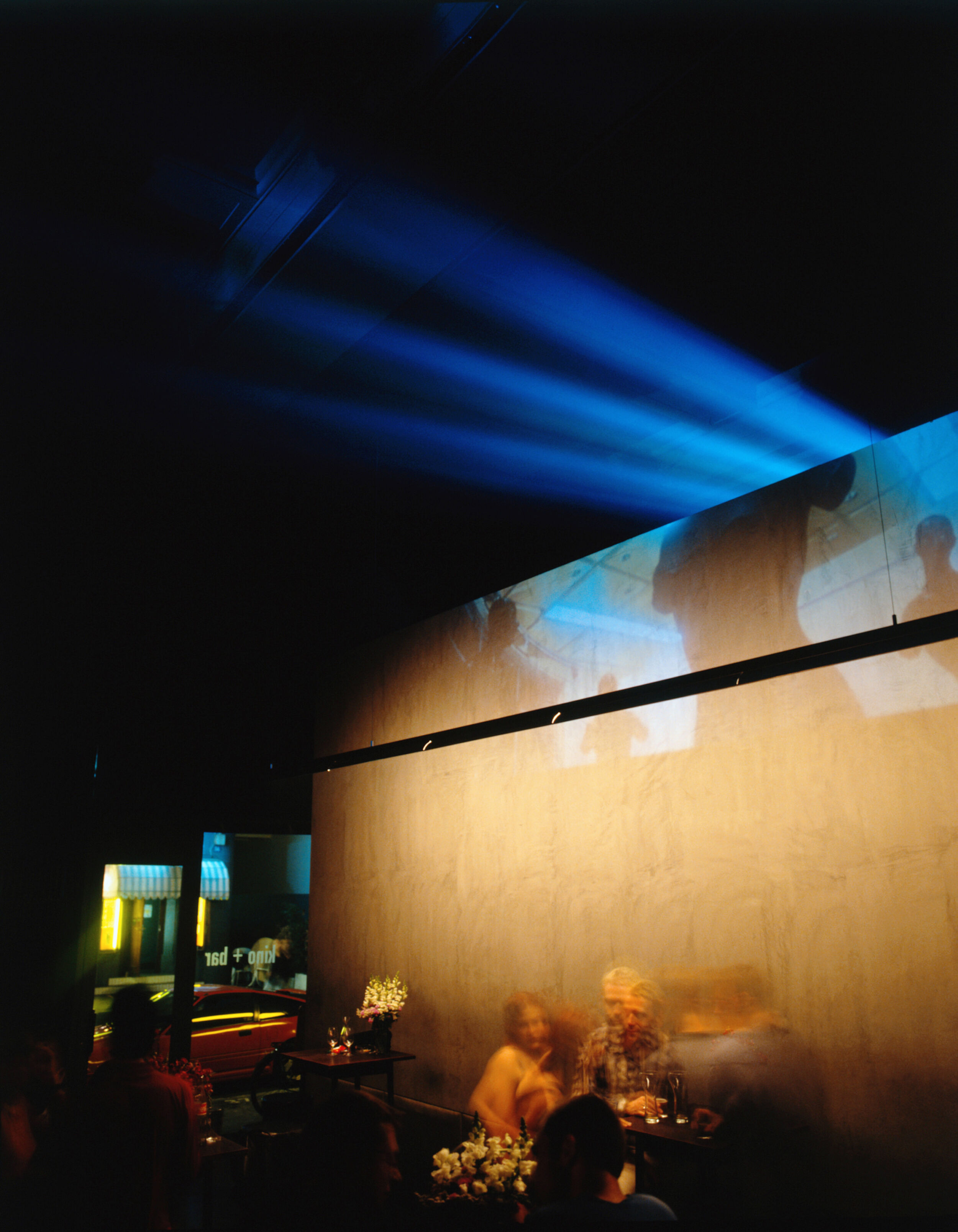 Als das RiffRaff 1997 an die Neugasse zog, war der Umbau eines heruntergekommenen Billardclubs in ein Kino ein Vorbote der Umwandlung eines berüchtigten Drogenquartiers. Mit dem Einbau von zwei Kinos und einer Bar in den ehemaligen Kinosaal aus den Zwanzigerjahren entwickelten wir eine besondere Projektionstechnologie. Vom ursprünglichen Projektionsraum wird das Filmbild über den kleinen Saal hinweg offen durch die Bar hindurch in den grossen Saal gestrahlt. Über der Bar hängt deshalb meist eine durchsichtige, bewegliche Lichtskulptur und an der Wand der Hauch eines gespiegelten Filmbildes. Um diesen Lichtstrahl herum ist das Kino entworfen, eine Atmosphäre nur aus dunklen Tönen, aus glänzenden Oberflächen und Reflexen verschiedener Lichtquellen. Selbst die Akustikpaneele sind textile Bilder, welche unter dem Saallicht ein Moiré wie ein Hologramm entwickeln.