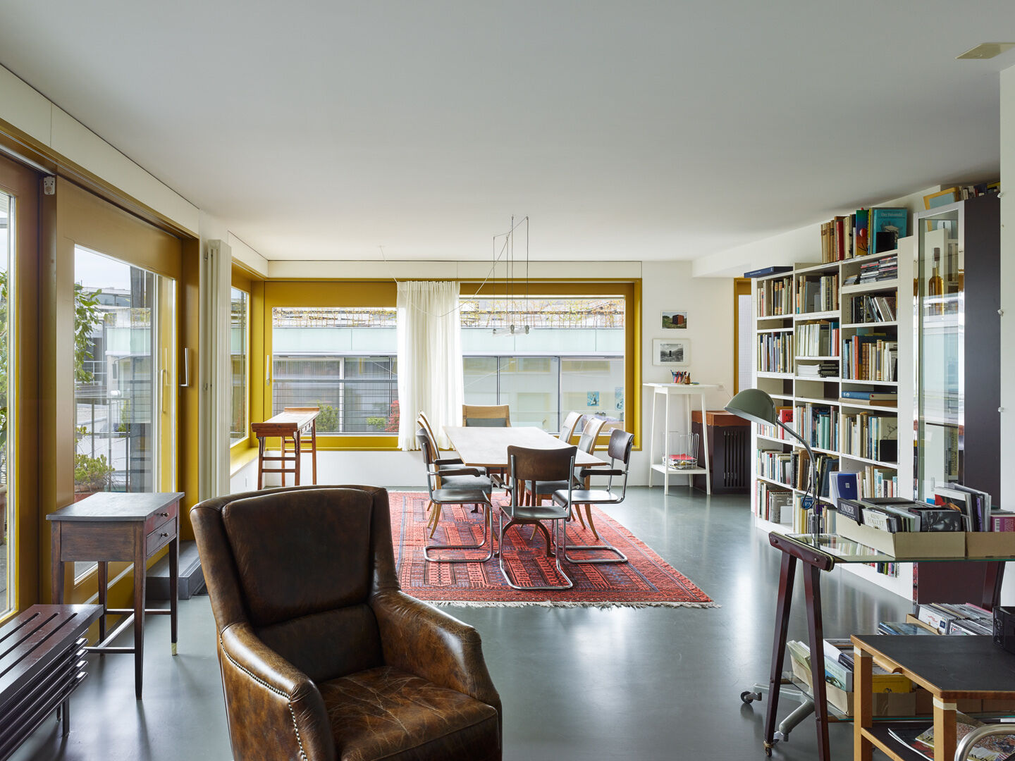 In den Wohngeschossen über dem Kino planten wir Grundrisse, welche den zellulären Charakter bürgerlicher Wohnungen mit der freieren Bewegung unbestimmterer Raumfolgen verbinden. Die Wohndiele ist nun zentraler Platz in der Wohnung, um den herum die Zimmer mit unterschiedlichem Charakter gruppiert sind. Durch ein offenes Bad wird ein zweiter Weg durch die Wohnung eingerichtet, dessen Rhythmus mittels verschiedener Türtypen kontrolliert wird. Grosse Fenster ziehen aus den engen Strassen die städtische Szenerie wie durch Lupen in den Wohnraum hinein. Von aussen suchen die übergrossen Fenster und die Wand mit ihrem feinen Gewebe unterschiedlicher Putzstrukturen und Farbtöne den Klang des umgebenden Bestandes zu dehnen, aber keinesfalls zu brechen.