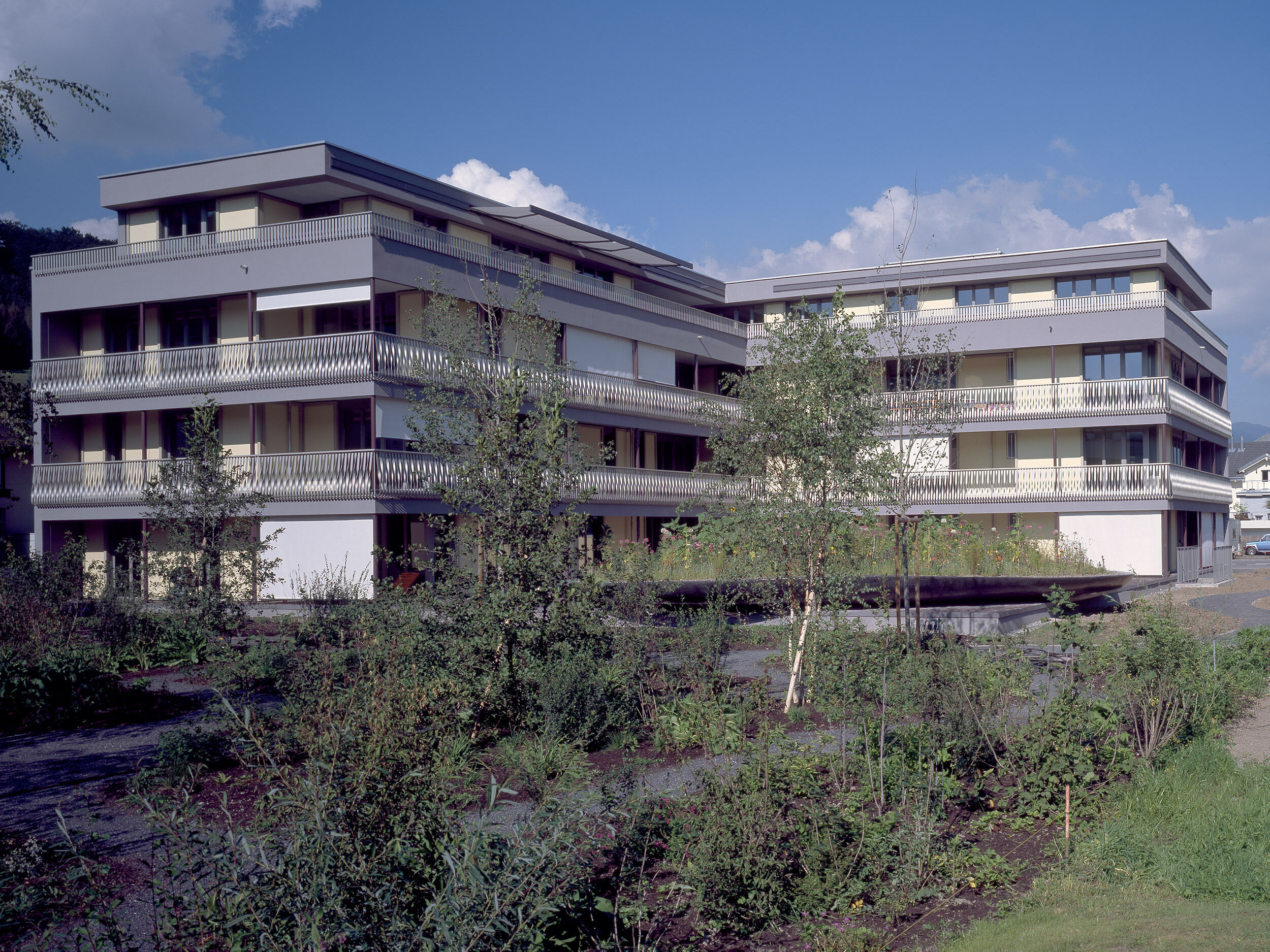 Die kleine Wohnanlage liegt in einer schönen Landschaft, aber in einer hässlichen Nachbarschaft - symptomatisch für die Urbanisierungsprozesse ausserhalb der alten Städte. Deshalb haben wir auf der seltsamen Form des Grundstücks die Aussicht selber gebaut. Anstelle des Abstandgrüns besetzt das künstliche Grün einer riesigen Baumvase den Vordergrund. Hinter dieser Terrassierung breitet sich ein wilder Garten aus, der sich in der Tiefe verliert. Eigentlich ist die Parzelle für die erwartete Dichte aber ungeeignet. Um das komprimierte Volumen räumlich zu organisieren, übertrugen wir Erfahrungen mit Wohnungen grosser Tiefe und geringer vertikaler Kongruenz aus dem City West Areal nach Tuggen.