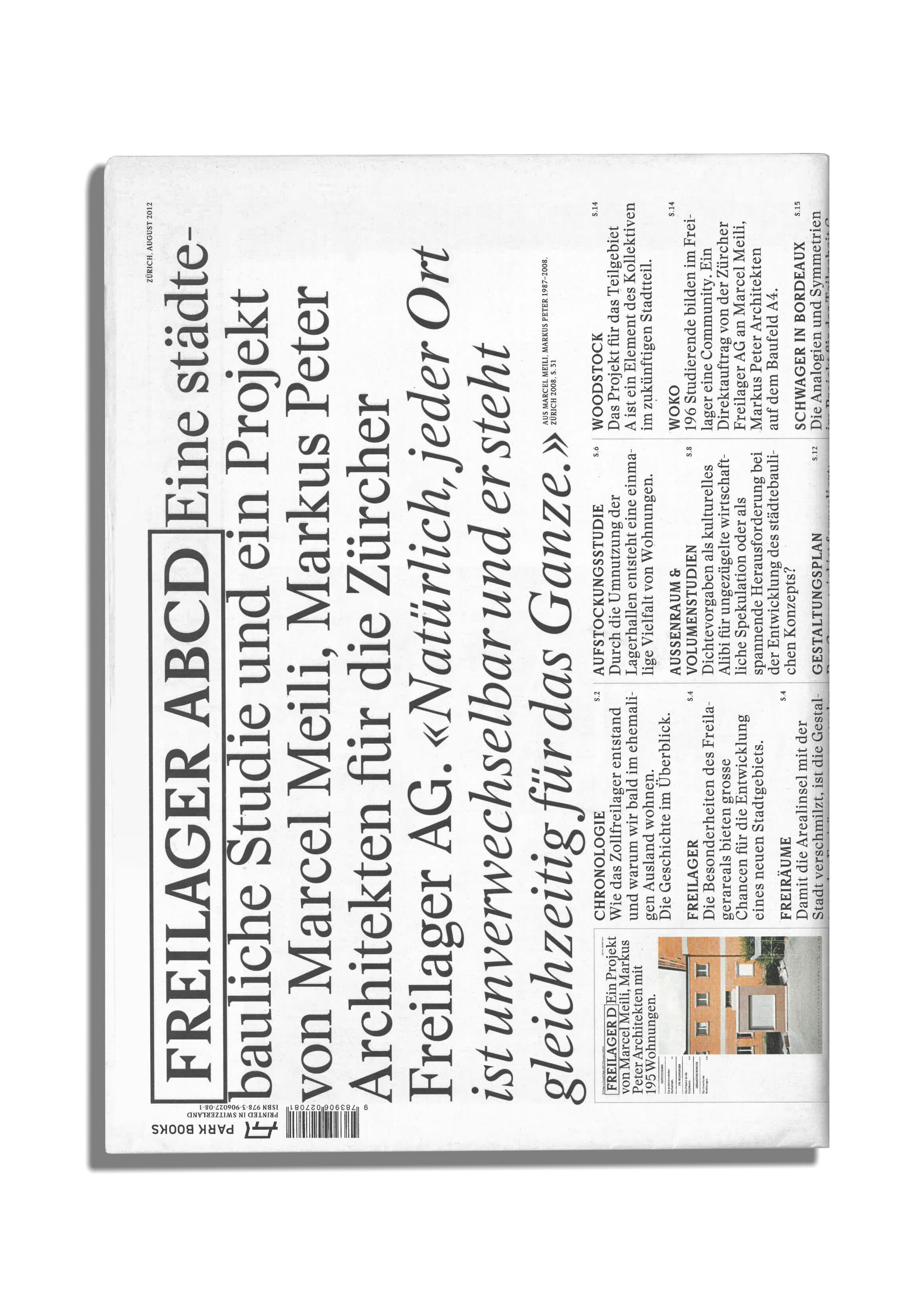Diese Publikation in Form einer Zeitung mit Magazin bietet Einblicke ins künftige Freilagerareal. Sie thematisiert in Fotografien, Modellen, Zeichnungen und Texten die Grundbedingungen, die Entwicklung und Ausprägung des Gestaltungsplans sowie seine Einbettung in die existierende Umgebung. Das Areal im Westen von Zürich entwickelt sich in den kommenden Jahren zu einem attraktiven städtischen Wohnquartier. Der private Gestaltungsplan von Marcel Meili, Markus Peter Architekten sieht rund 1000 Wohnungen für eine breite Bevölkerungsschicht vor. Das Magazin ist den 195 Wohnungen gewidmet, die Marcel Meili, Markus Peter Architekten im Freilager D durch die Aufstockung der Gründerbauten entworfen haben. Insgesamt sind 49 verschiedene, teils einmalige, Grundrisse entstanden. Die verschiedenen Wohnungstypen werden in Grundrissen und in detailliert ausgearbeiteten Modellen vorgestellt.